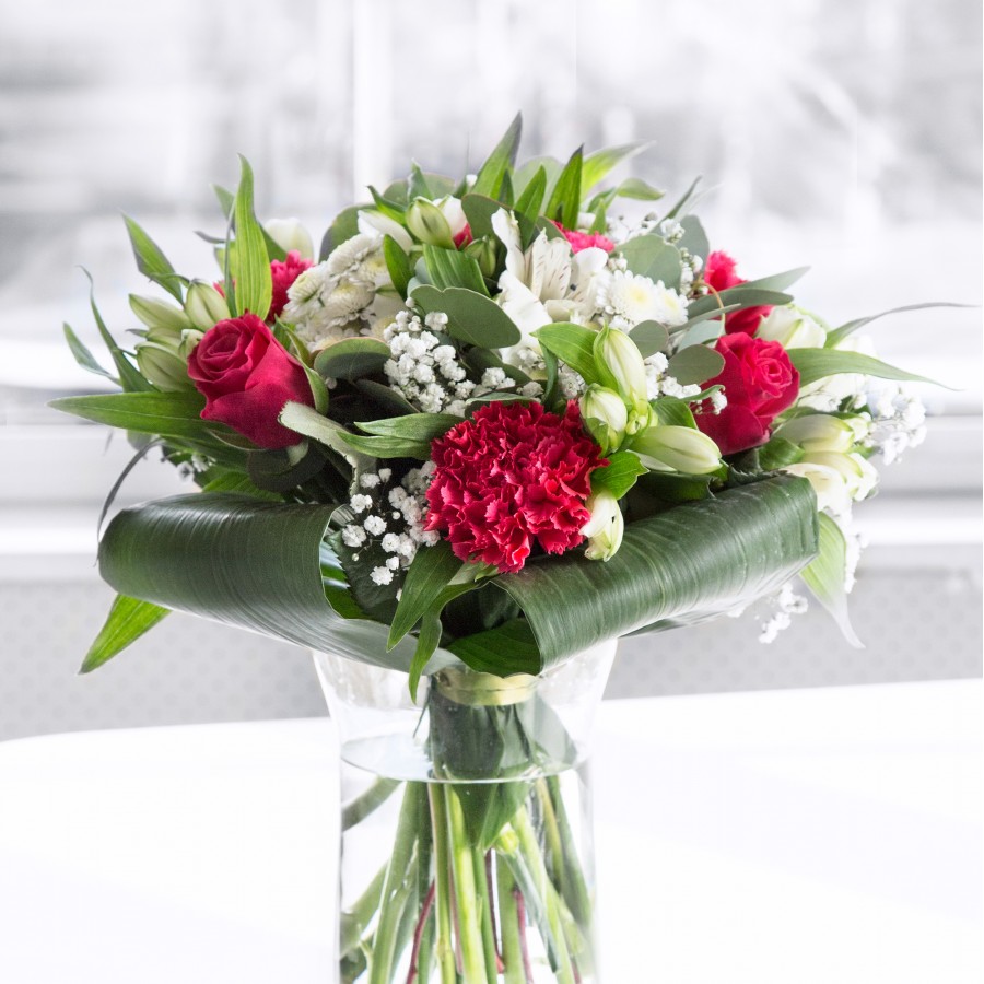 Elevate every occasion with our Vibrant Essence Bouquet. This vibrant arrangement showcases a harmonious blend of soft white chrysanthemums, delicate gypsophila, sumptuous red roses, and charming carnations, further enhanced by white alstroemeria and lush aspidistra leaves. Each component is meticulously hand-picked at its peak to offer the ultimate in freshness and luxury.